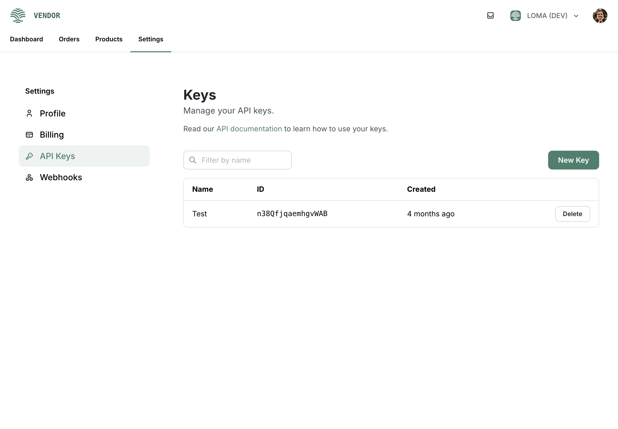 Vendors can create API keys by navigating to the “API Keys” section in the settings page.